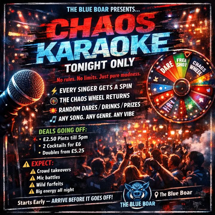 🔥 CHAOS KARAOKE IS BACK TONIGHT 🔥 This ain’t your normal sing along… this is CHAOS EDITION 😈 🎤 Step up. Sing your tune. 🎡 SPIN THE CHAOS WHEEL 💥 Win shots, prizes or get hit with a madness dare No rules. No limits. Just pure energy all night. ⚡ EVERY singer gets a spin 🎶 Any song. Any vibe. 🔥 Crowd going OFF guaranteed 🍹 DEALS RUNNING: £2.50 pints till 5pm 2 cocktails for £6 Doubles from £5.25 ⚠️ Last time was RAMMED so don’t be the one stuck at the bar… GET DOWN EARLY 📍 The Blue Boar 🕗 Tonight #BlueBoar #KaraokeChaos #AbingdonNights #NightlifeUK #PubVibes #KaraokeNight #SpinTheWheel #GoingOut #LiveLoud